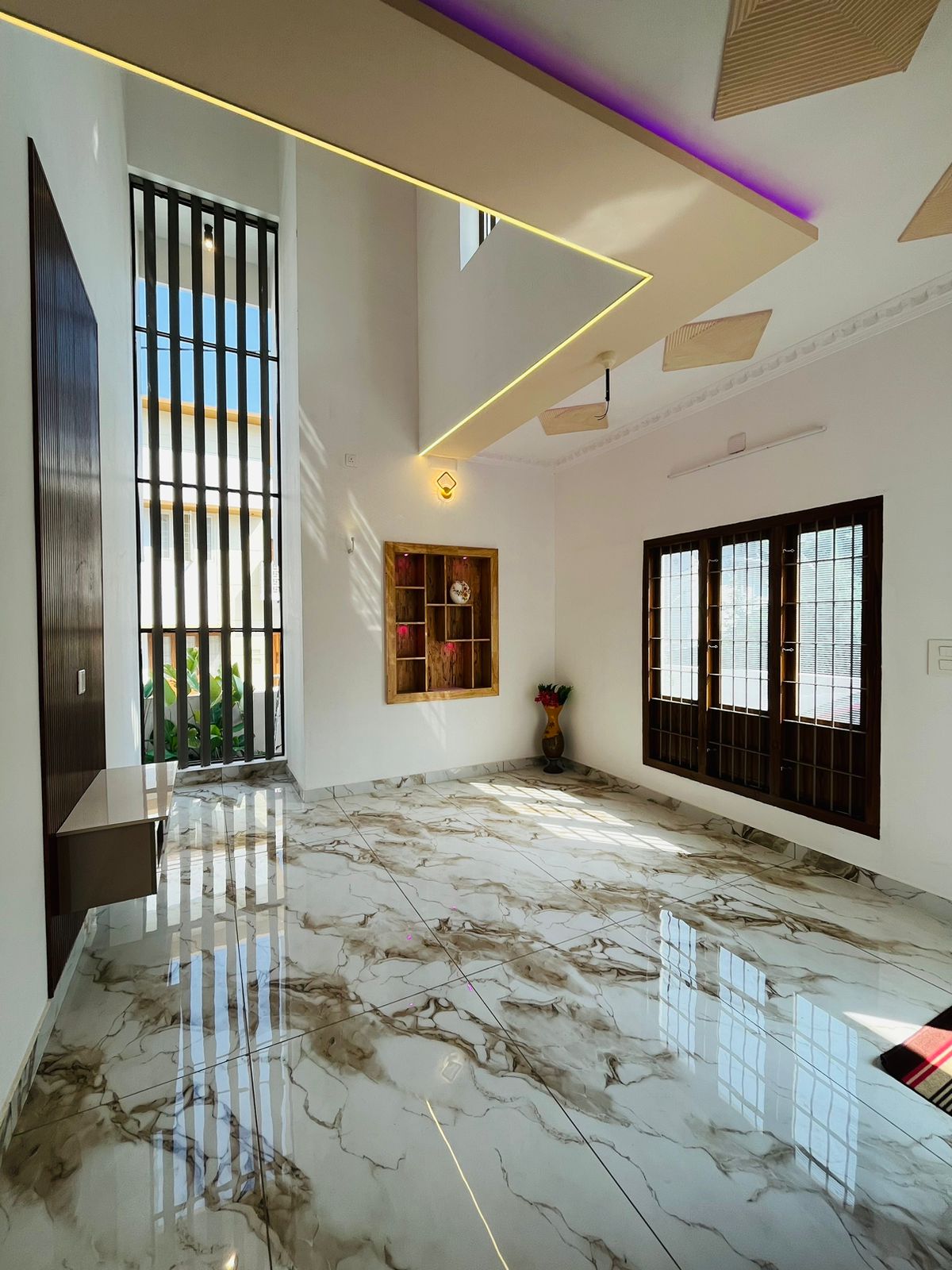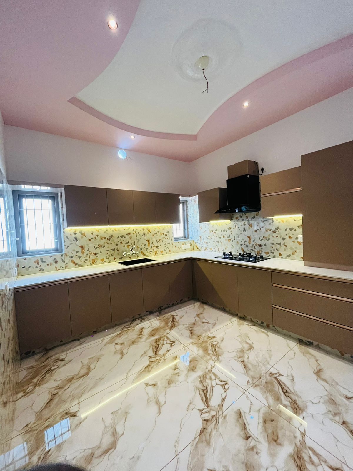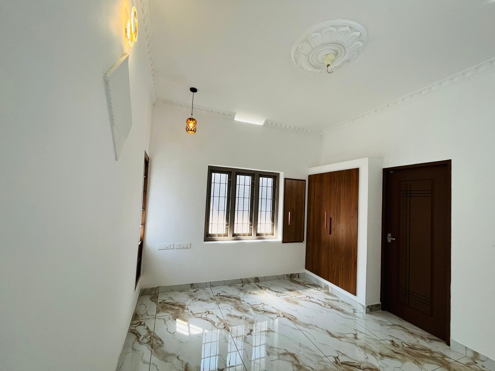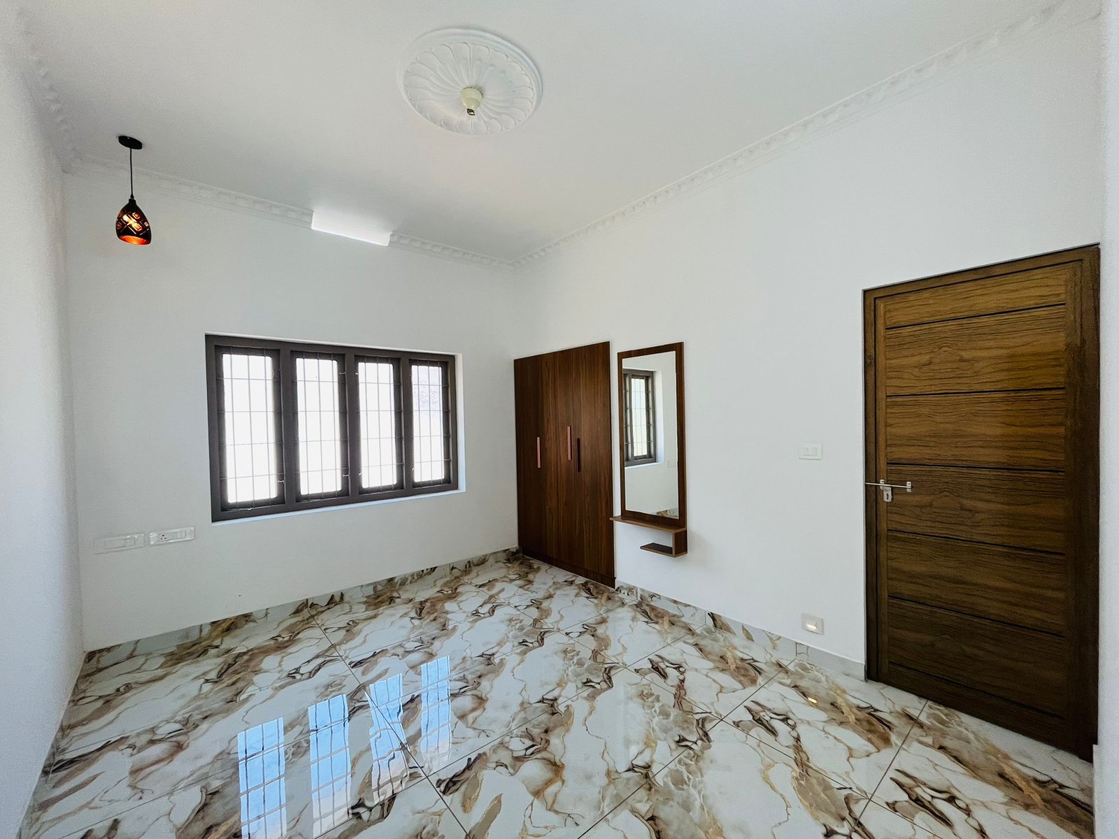 Ground floor- Sitout, living area, dining hall, Two bedrooms with attached Washrooms, one common washroom, kitchen, work area, exists. Kitchen cabinets & wardrobes work completed with necessary light fitting arrangements.